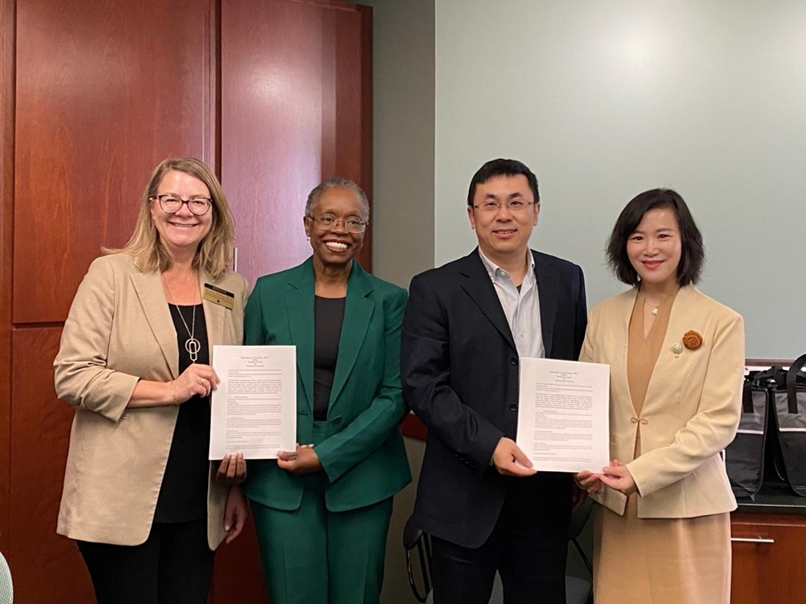 The delegation visited the College of Communication Arts and Sciences at MSU and its Office of China Program. Vice President Zhang Xiaohong, Dean Chao Naipeng, and Associate Dean Yang Guang engaged in extensive discussions with Teresa Mastin, Vice President and Dean of the College of Communication Arts and Sciences at MSU, Kjerstin Thorson, Associate Dean for Strategic Planning, and Geri Zeldes, Associate Dean for Academic Affairs and Graduate Education, exploring collaboration opportunities in scientific research, inter-college and school-wide academic exchanges and talent training projects. They reached multiple collaborative intentions, including undergraduate exchange programs, short-term exchange programs, and joint doctoral training programs. A memorandum of cooperation was signed between the two institutions.