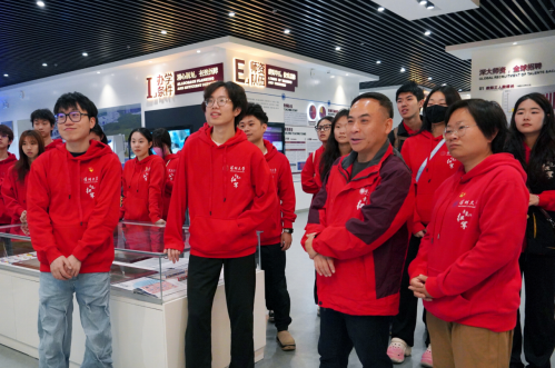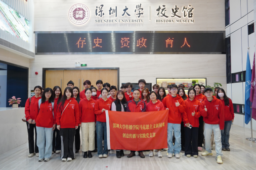 马克思主义新闻观创意传播与实践党支部与大型原创剧目《亲爱的红军》创作团队走进深圳大学校史馆,以校史研学的特殊形式开启新学年思政教育新征程。在参访深圳大学校史馆过程中,师生重温学校与国家同呼吸、与特区共奋发的历史足迹,感悟深大“自立、自律、自强”的精神内核,并围绕创建“双一流”高校,服务教育强国建设、助力“双区”发展战略的重要使命展开讨论。
