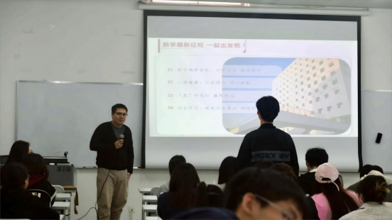 新学期主题班会 随后,班主任聂鑫老师就学风建设、课程安排、学生生涯规划等主题与学生们展开分享与讨论。在学风建设方面,聂鑫旁征博引,生动地阐述了优良学风对于个人成长和知识积累的重要性,并鼓励同学们积极营造互相学习、互相促进的班级氛围。谈及课程安排,聂鑫详细地为同学们解读了本学期的课程设置逻辑,耐心解答了同学们对于课程难度、时间分配等方面的疑问。他强调课程之间的关联性,引导同学们合理规划学习时间,以达到最佳的学习效果。在学生生涯规划上,聂鑫耐心地倾听同学们的想法和困惑,为大家提供了建议和指导。